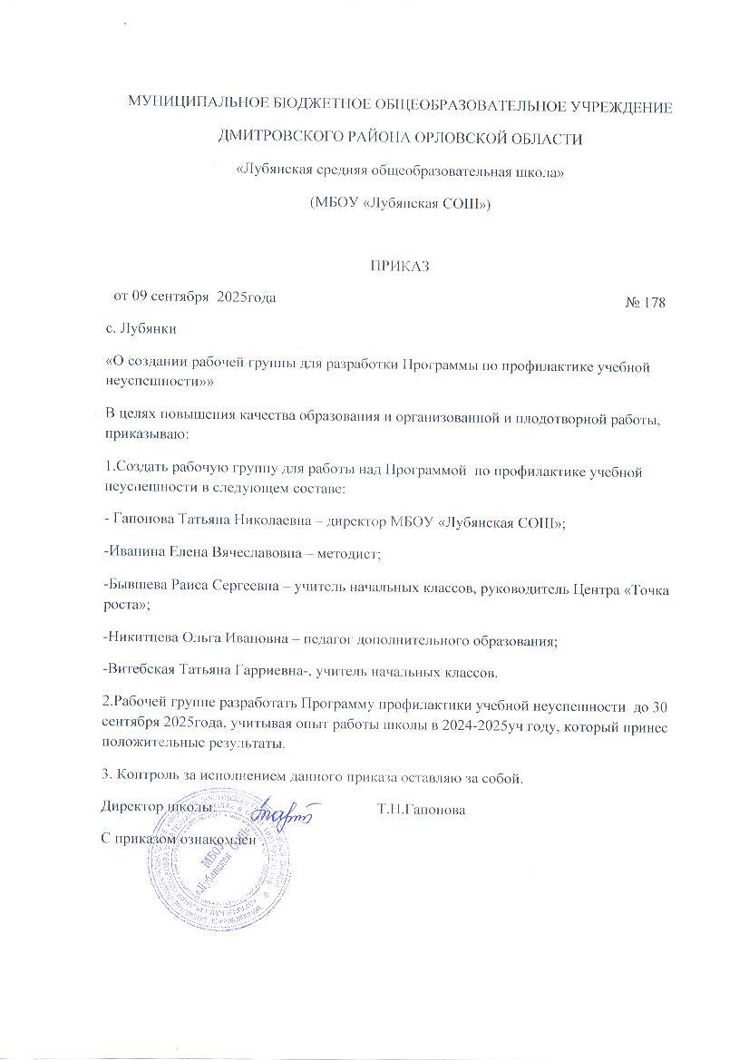О создании рабочей группы для разработки Программы по профилактике учебной неуспешности